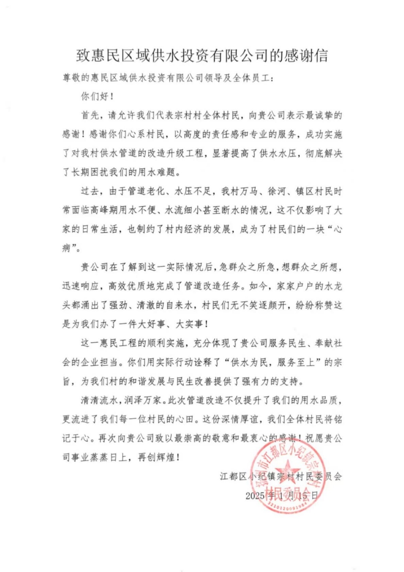 小纪供水管理所收到了一封饱含感激之情的感谢信是这样说的:“贵公司以高度的责任感和专业的服务,成功实施了对我村供水管道的改造升级工程,显著提高了供水水压,彻底解决了长期困扰我们的用水难题。”“清清流水,润泽万家。此次管道改造不仅提升了我们的用水品质,更流进了我们每一位村民的心田。这份深情厚谊,我们全体村民将铭记于心。”捧着这封感谢信反复读着、看着,供水人的内心是“激动的”,让我们深切感受到付出被看见的温暖,内心充满了难以言表的激动与自豪。感动之余,内心也是“忐忑的”,我们更深刻地认识到,信中的每一句感谢,都让我们更加清醒地意识到身上所肩负的使命,责任感在心中愈发坚定与强烈。