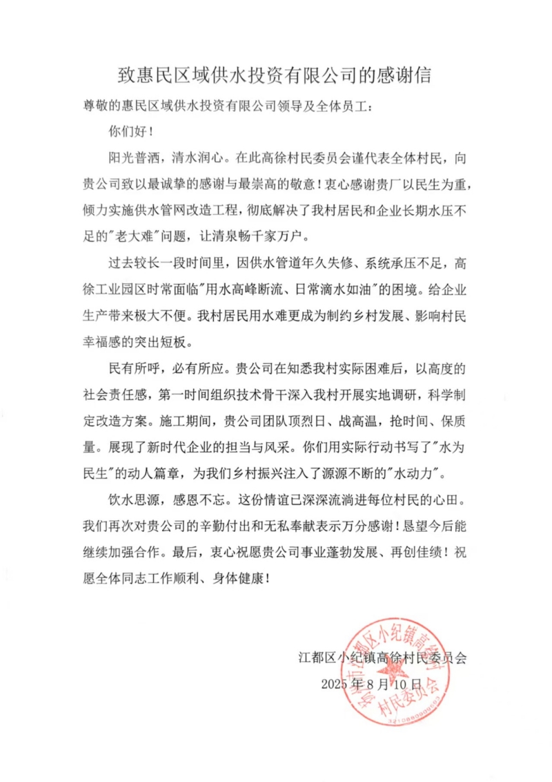 近日,扬州市惠民区域供水投资有限公司收到了一封来自小纪供水管理所转达的小纪镇高徐村民委员会的感谢信。信中对惠民公司为村里进行的管道改造工程表达了诚挚的感谢,称赞惠民公司为村民办了一件实实在在的民生大事。