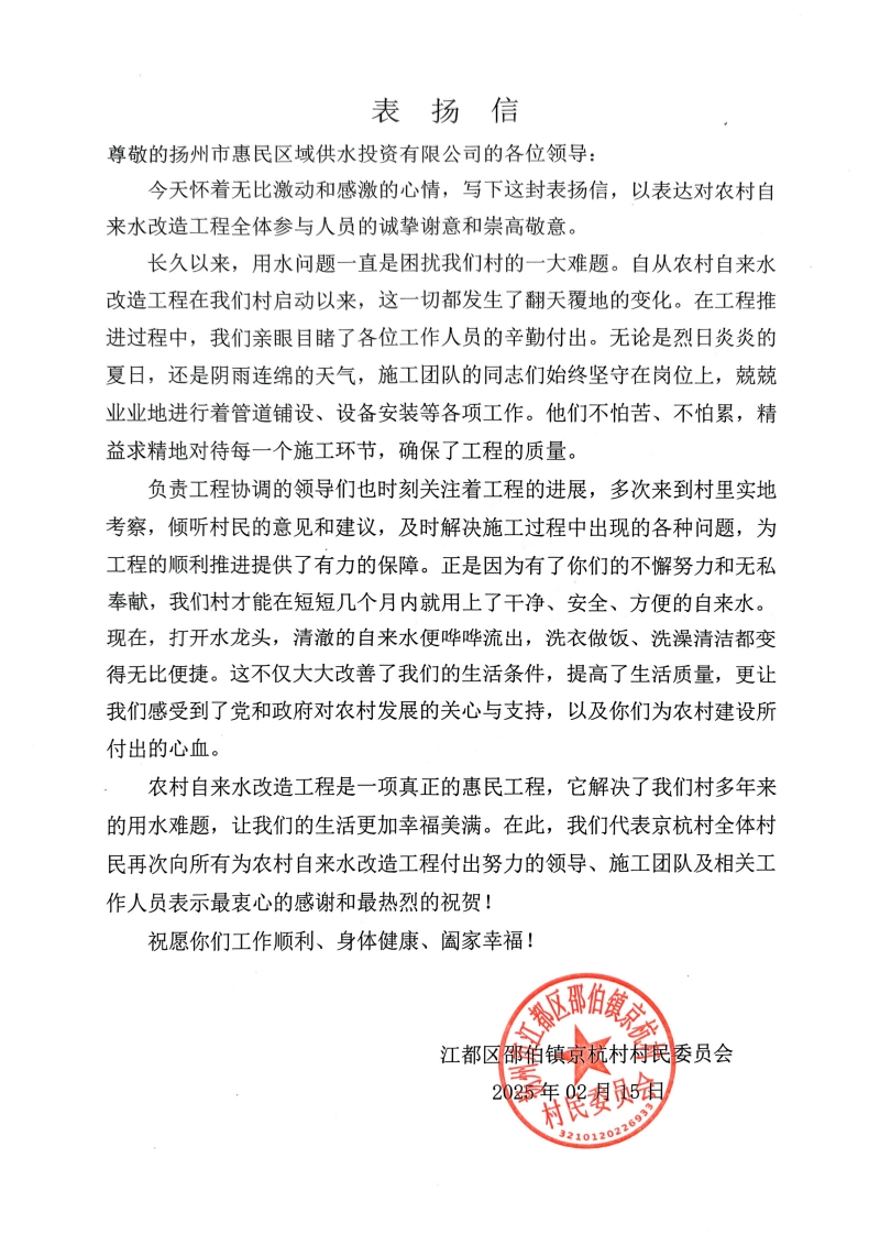 “以前村里因为用水问题,邻里之间偶尔会闹矛盾,现在水的问题解决了,大家的关系也更和睦了。”村干部笑着说。村民们自发组织起来,写了这封表扬信,用最朴素的方式表达感激之情。“这封信虽然写得简单,但每一个字都是我们的心里话。贵公司帮我们解决了大难题,我们打心底里感谢!”